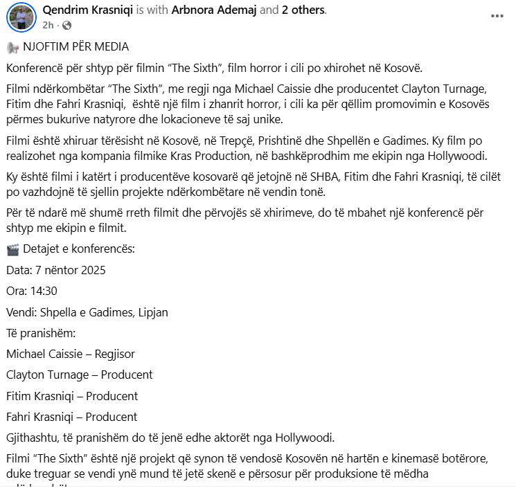 Filmi ndërkombëtar “The Sixth”, i zhanrit horror, po xhirohet në Kosovë dhe synon të promovojë vendin përmes bukurive natyrore dhe lokacioneve unike.