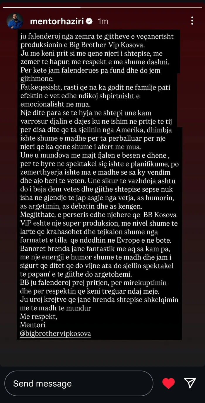 Këngëtari i njohur Mentor Haziri ka njoftuar daljen e tij nga garë në “Big Brother VIP Kosova 4”, vetëm pak më shumë se 24 orë pas hyrjes në shtëpi.